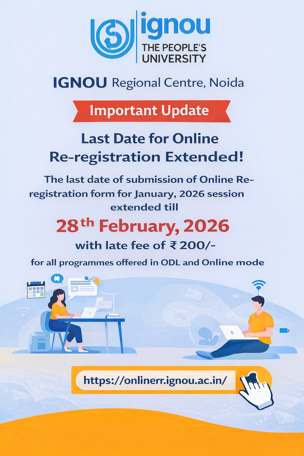 The last date of submission of Online Re-registration form for January, 2026 session extended till 28th February, 2026 with late fee of Rs. 200/- for all programmes offered in ODL and Online mode. Re-registration Link: https://onlinerr.ignou.ac.in/