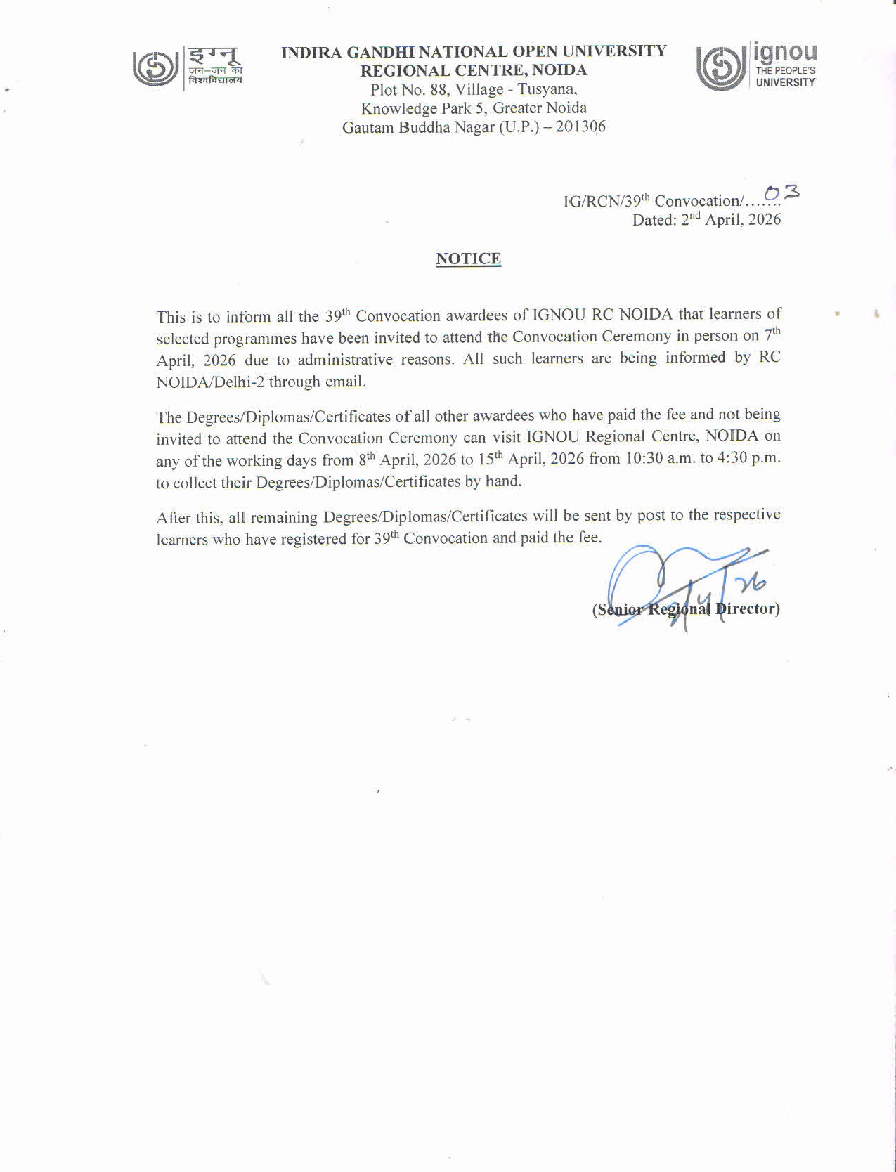 Notice regarding 39th Convocation Degree & Diploma - RC Noida