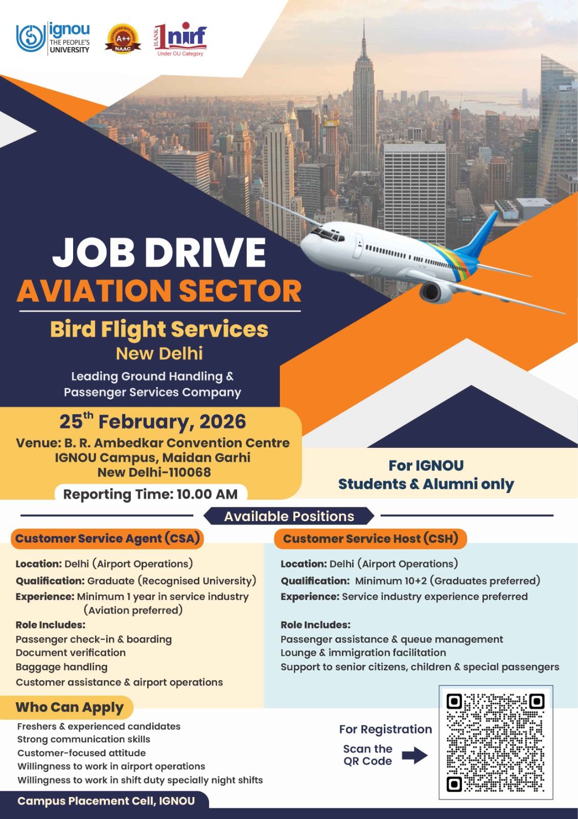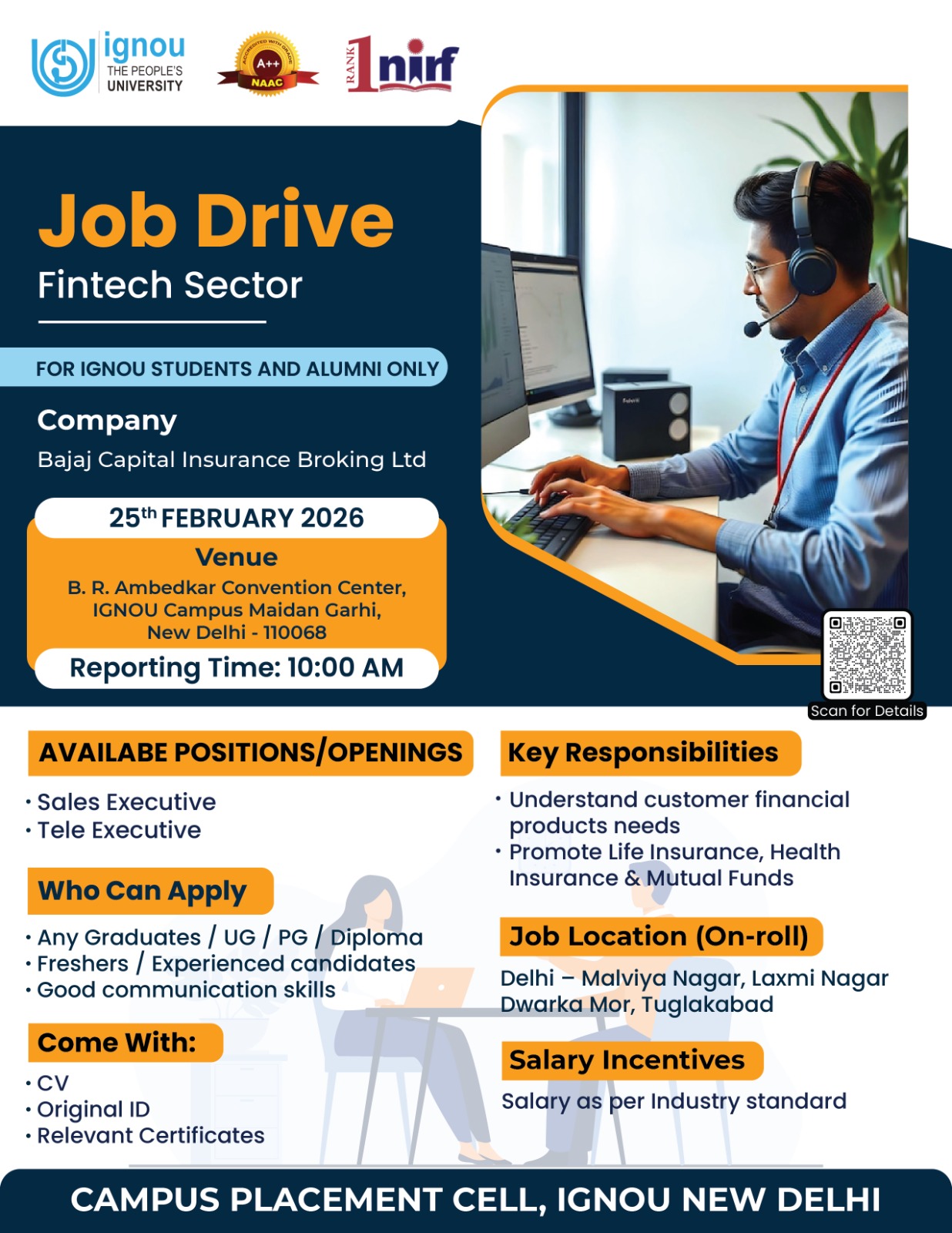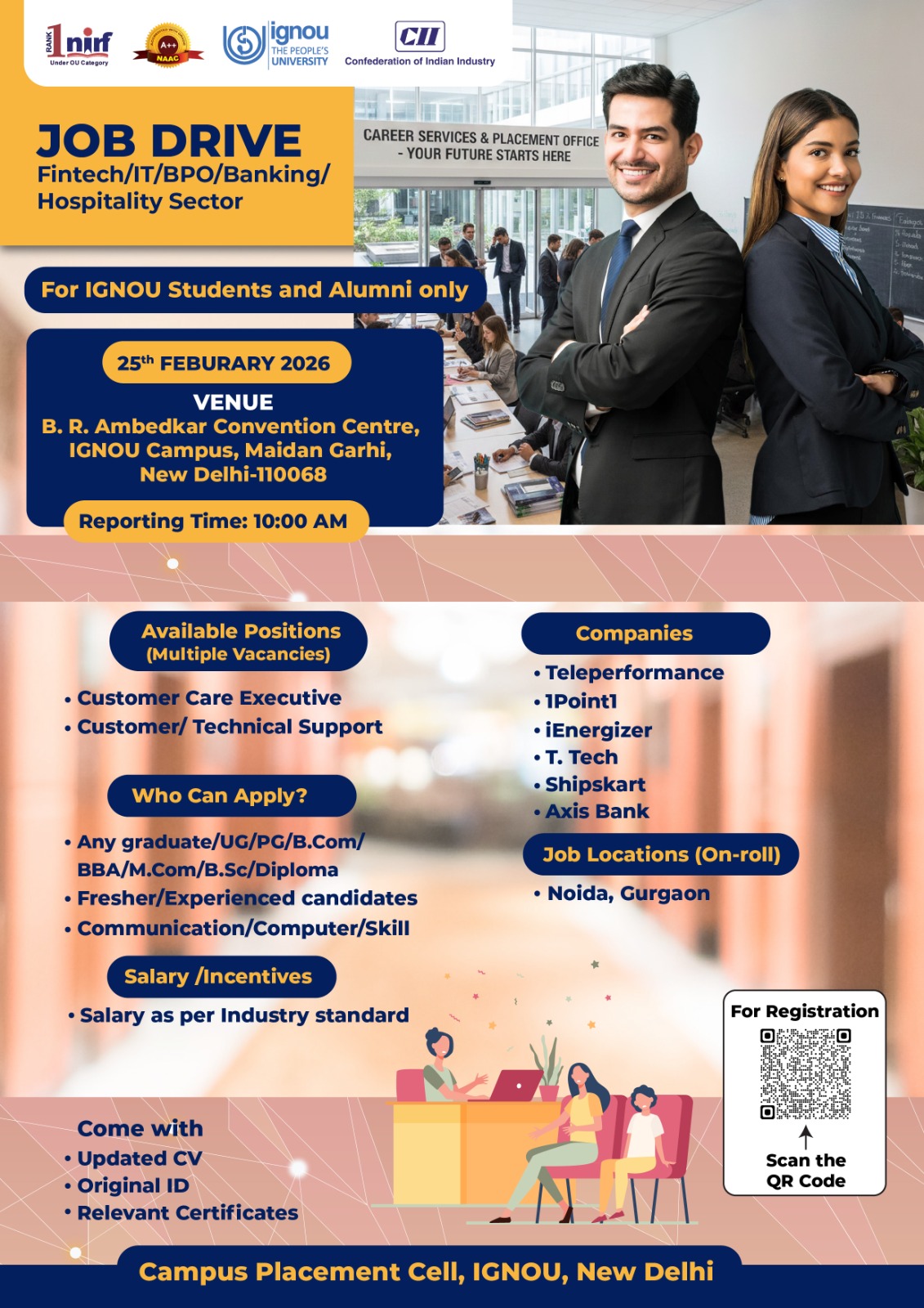 The Campus Placement Cell (CPC) of IGNOU is organizing a campus placement drive on 25 February 2026 at the BR Ambedkar Convention Centre, IGNOU Headquarters, Maidan Garhi, New Delhi – 110068.