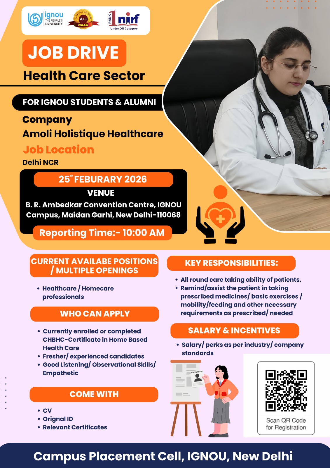 This placement drive will be particularly beneficial for students seeking job opportunities especially from B.A., B.Ed., B.Sc., B.Com, BBA, M.Com, PG Diploma, Diploma, and Certificate in Home Based Health Care (CHBHC) programmes in the Delhi-NCR region.