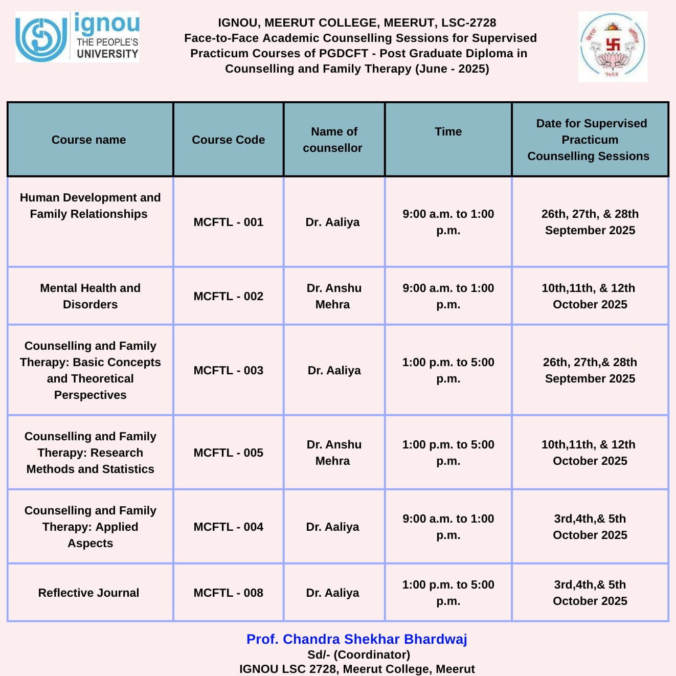 THEORY COUNSELLING SCHEDULE IGNOU STUDY CENTRE-3702 M.S. COLLEGE, SAHARANPUR [04.08.2025]