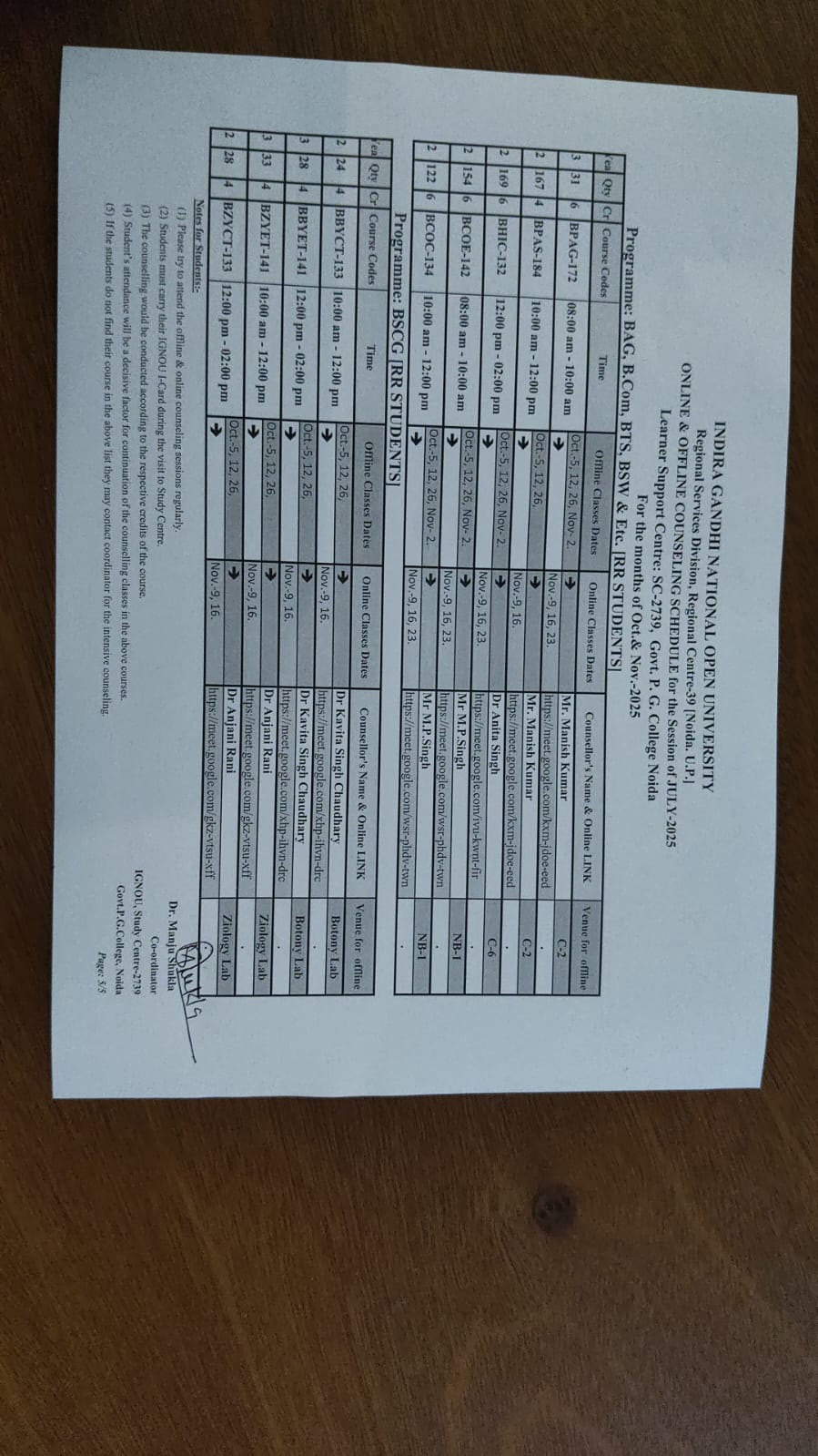 Counseling Schedule : Masters and Bachelors Programme IGNOU STUDY CENTRE - 2739 Govt. PG College Noida Session Jan-2025 [07.08.2025]
